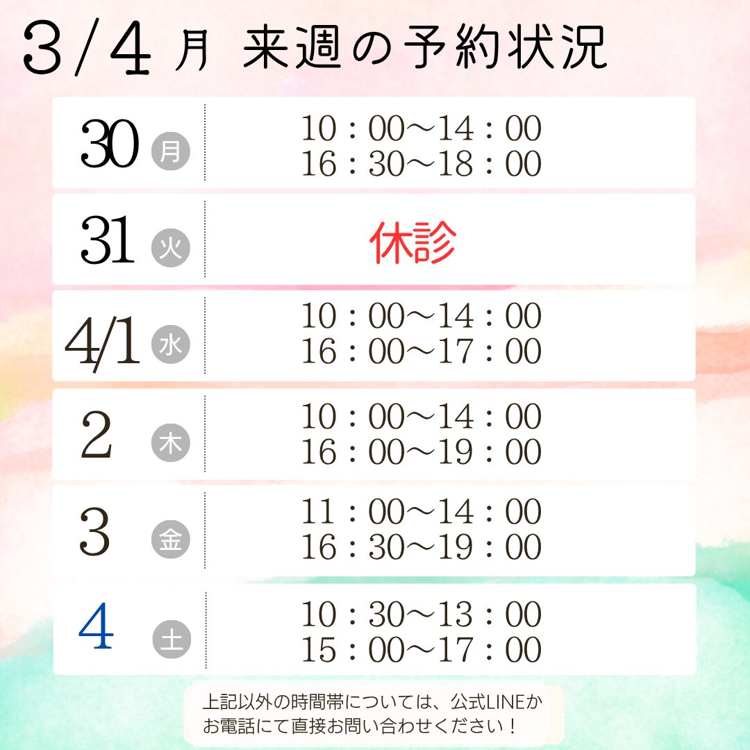 ※当日キャンセル等もありますので、下記日時以外にも空いている時間帯がございます。