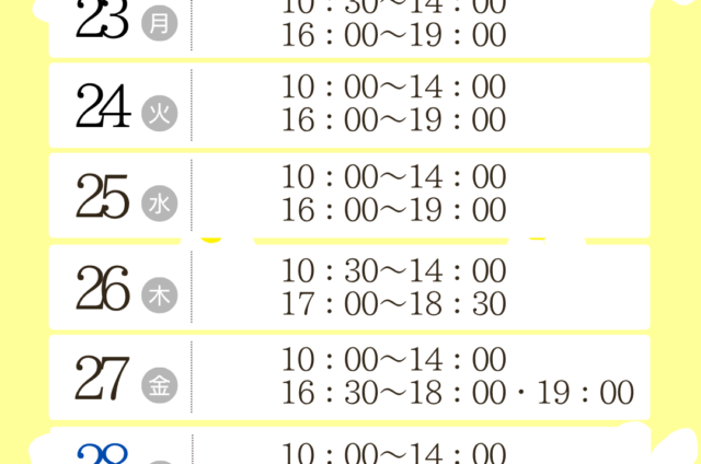 ※当日キャンセル等もありますので、下記日時以外にも空いている時間帯がございます。