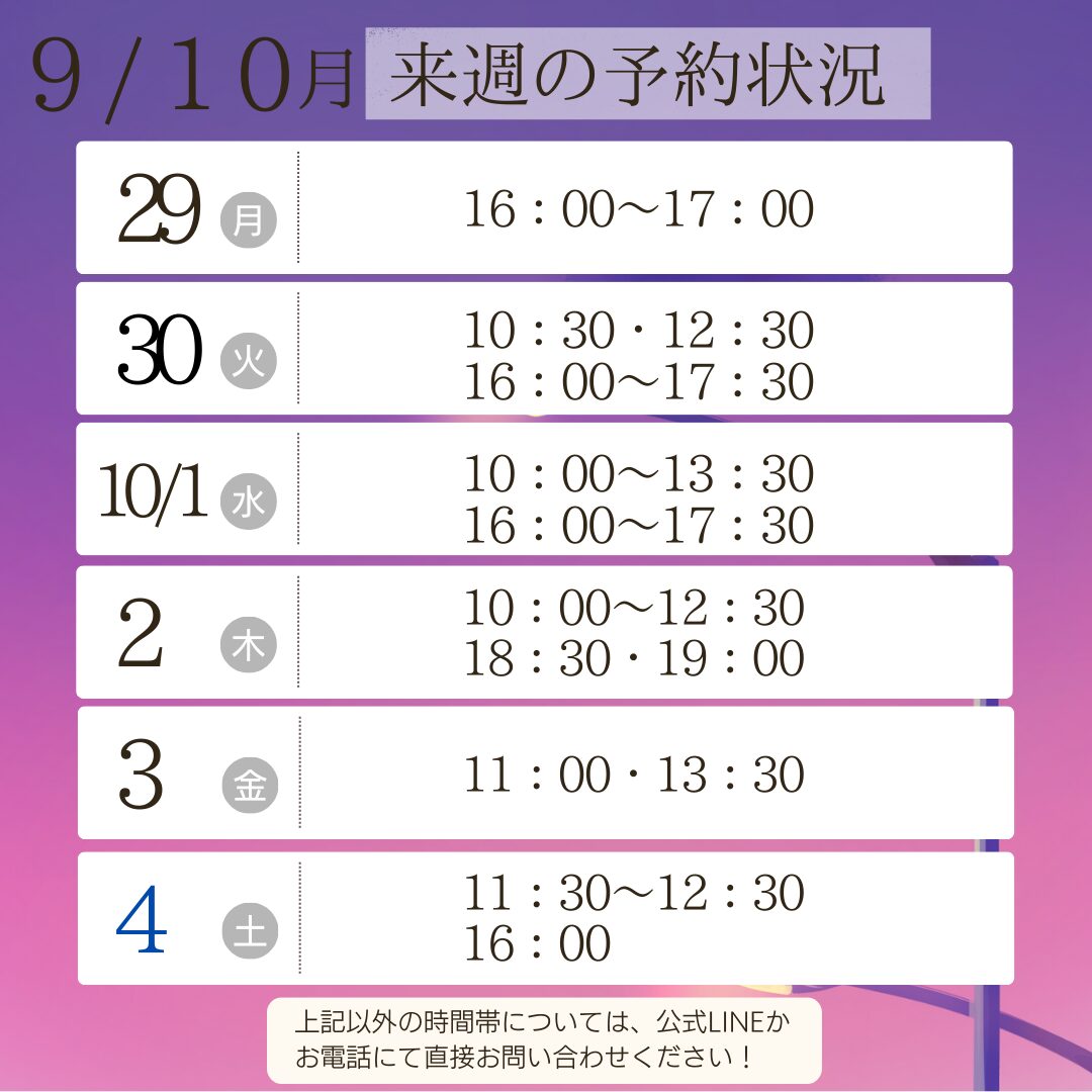 ※当日キャンセル等もありますので、下記日時以外にも空いている時間帯がございます。