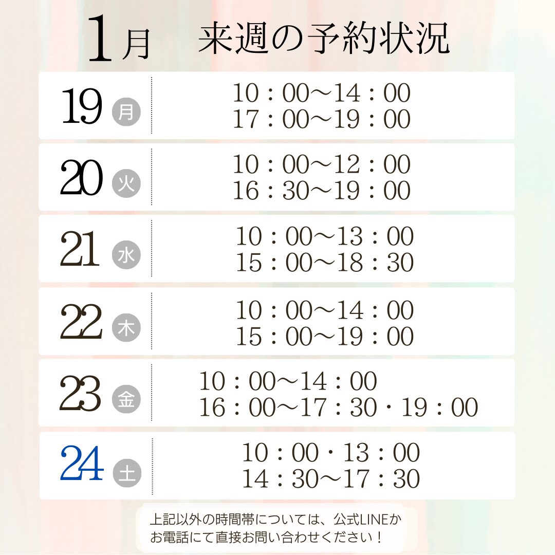 ※当日キャンセル等もありますので、下記日時以外にも空いている時間帯がございます。